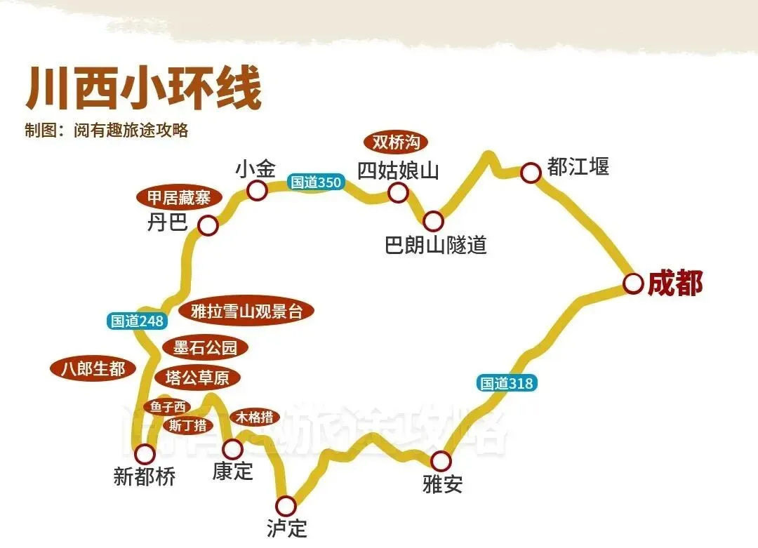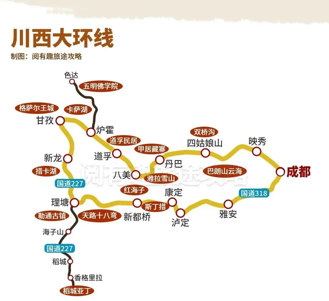 从靠鸡排哥出圈的古窑景区;到冰雪季“宠客”的哈尔滨;从超级工程变身网红打卡地的花江峡谷大桥;一个接着一个...“徘徊于北纬30度的横断山区,是中国最美的地方。”7个垂直自然带,28座海拔6000+雪山......总览:川西大环线是一条经典自驾旅游线路 。全长约2400公里,连接了主要自然与人文景观。常规路线以成都为起点和终点,途经康定、理塘、色达等地。建议游玩7-8天。串联了雪山、草原、峡谷、湖泊等多种壮丽自然景观,深入横断山脉核心区,集中呈现了极致的垂直地貌带景观。- D1:成都—红海子—斯丁措—墨石公园—鱼子西—新都桥(住宿)