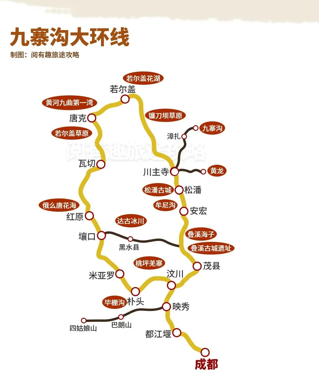 总览:九寨沟大环线,这是一条以成都为起点和终点,串联九寨沟、黄龙、若尔盖大草原等川西北部核心景区的经典观光自驾环线。D1:成都-猫鼻梁-四姑娘山双桥沟-汶川/都江堰