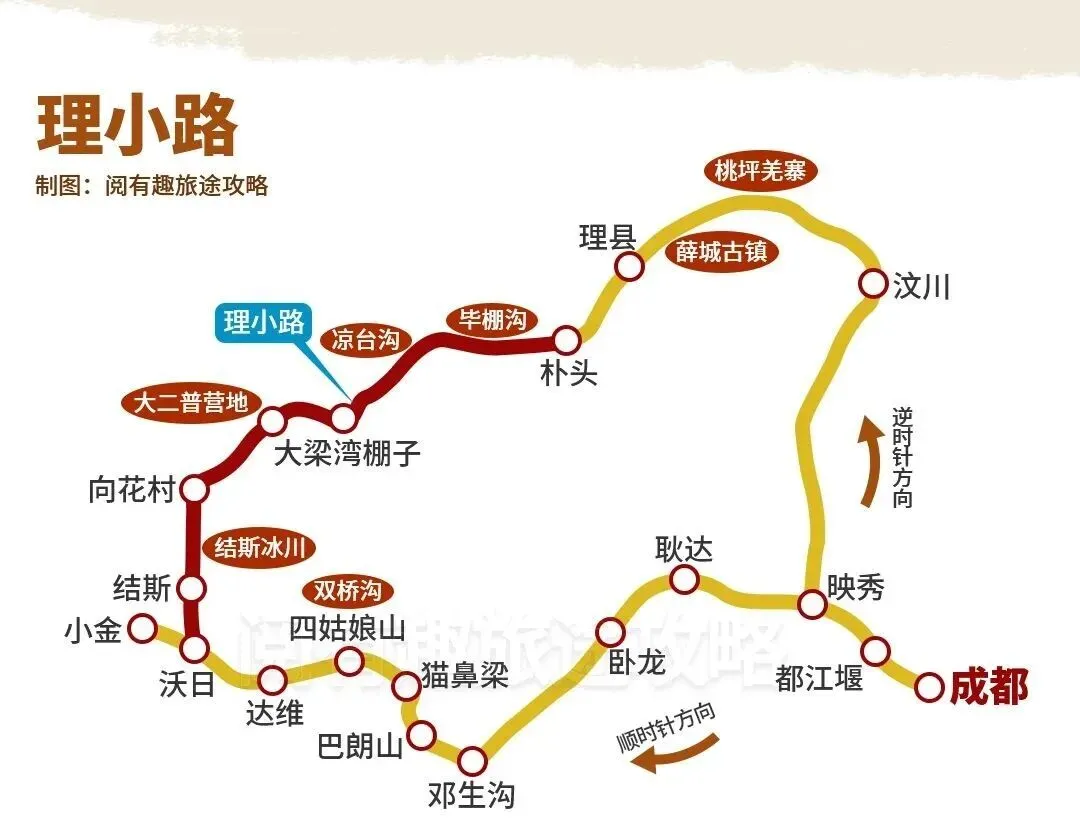 理小路,这条连接阿坝、理县和小金县的省道450线,因其串联雪山、森林、河谷、冰川等川西经典元素,被誉为“四川人自己的独库公路”。相比热门的四姑娘山常规线,理小路串联了结斯冰川、凉台沟、大二普营地等小众景点。总览:三条线均以宝兴县为起点枢纽,是邛崃山脉里的小众高原越野 、风光环线。路线:宝兴(穆坪镇)—陇东镇—中岗村—两河口—捧塔—金汤—康定;官方段 81 公里(宝兴—康定两河口),延至康定市区约 126 公里。景观:东拉山大峡谷(4A,红叶季爆款)、夹金山、武檀雪山、高山草甸、长海子;兼具红军长征红色印记与原始雪山峡谷风光。路线:两河口—汗牛—花牛村—美沃—小金,全程约 145 公里,核心翻越木壳壳梁子(约 4580m),是避开巴朗山、直达四姑娘山的小众通道。景观:木壳壳梁子雪山群观景台(可远眺四姑娘山、夹金山)、高山牧场、河谷风光,游客密度远低于常规线。③宝丹线: