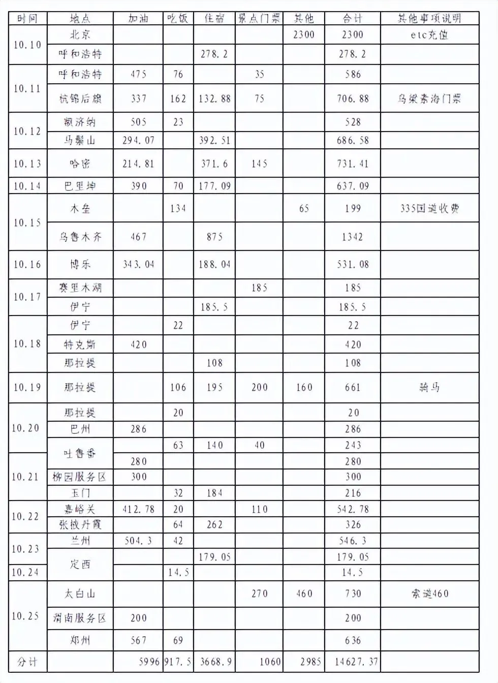 我们开的是排量3.5的丰田普拉多,百公里平均11个油不到,燃油的总开支相对来说,还不是很大,但如果换成本田CRV或奥迪Q5,基本还可以再省2千元。我们是2个45岁的老男人,对吃不怎么讲究,所以吃的开支也不大。住宿是中等水平。景点门票是一个人开支,退役军人免票,交通费不免。