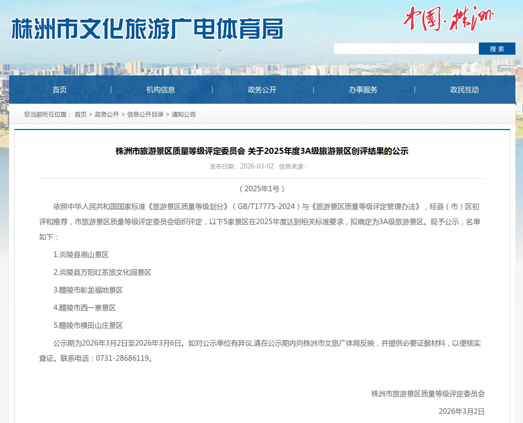 株洲市旅游景区质量等级评定委员会2025年度创评结果公示圆满结束,正式确定炎陵县湘山景区和炎陵县万阳红茶旅文化园景区为国家3A级旅游景区。