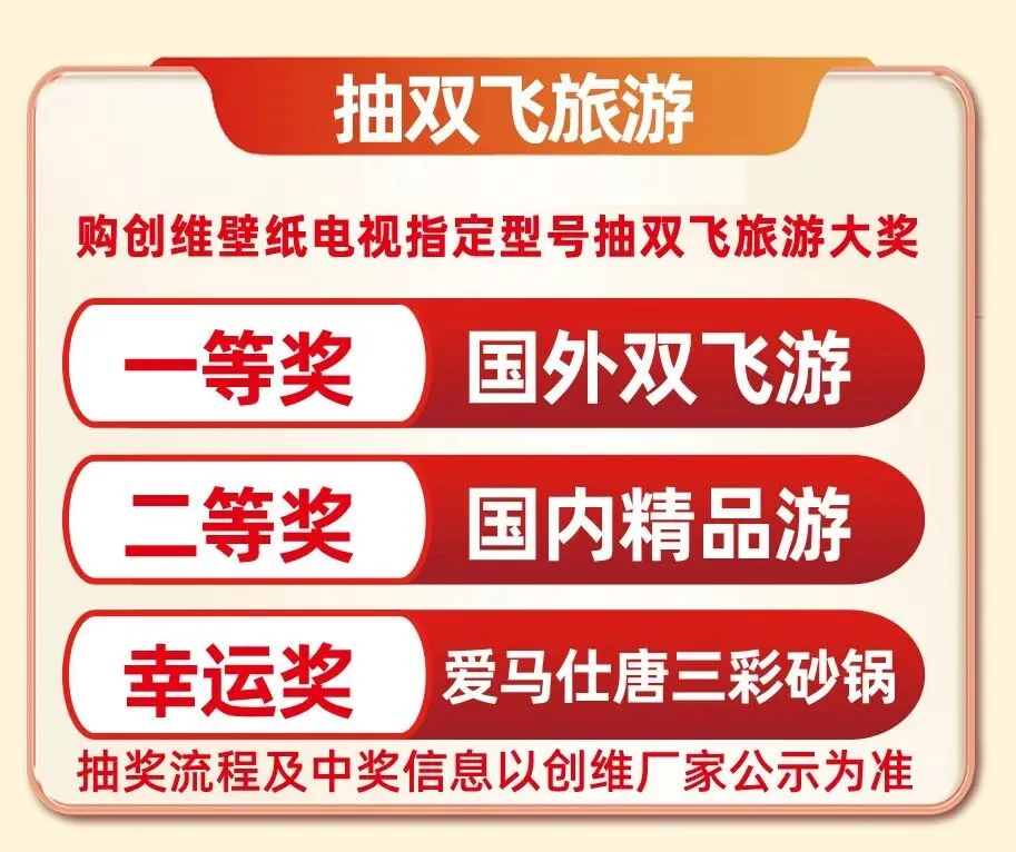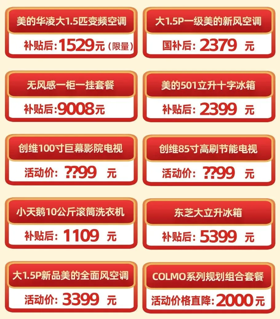 认筹锁定福利,额外加送好礼 美的专享 抖音抢美的专属代金券 空调专享,礼遇升级 十年包修,安心无忧 创维专享 购创维电视,抽双飞大奖 购创维指定电视,赢新马之旅 购美的,创维享立减 买美的 用国补 更划算