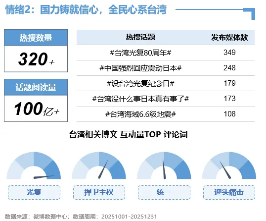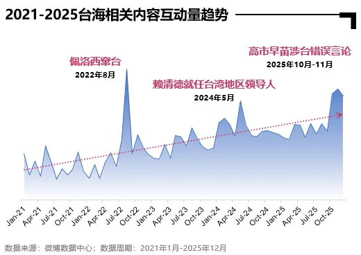 日本首相高市早苗近期发表错误涉台言论,严重触及中国红线,引发公众强烈反应。微博数据显示,近5年来公众对台湾议题的关注逐年升高,同时中国综合国力的增强和国际地位的提升,使公众在认知上更具底气,大陆在经济、科技与国防领域的进步,极大的增强了民族向心力。