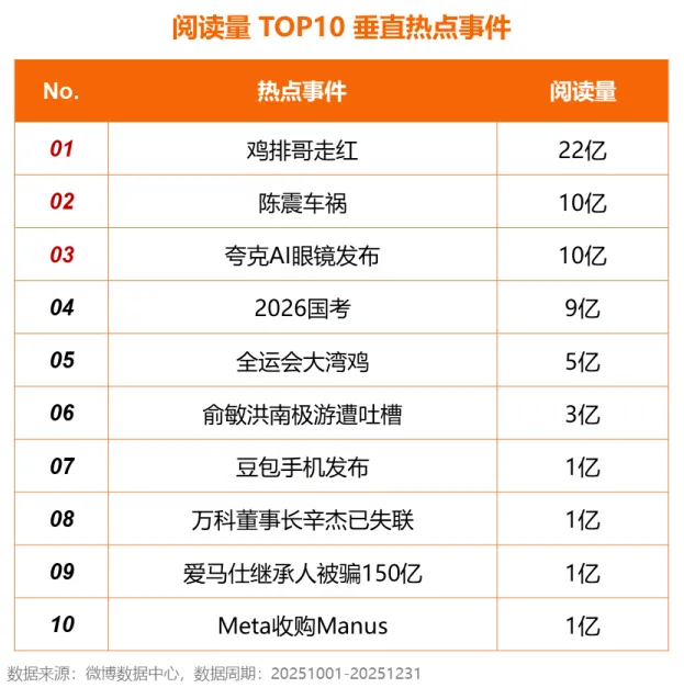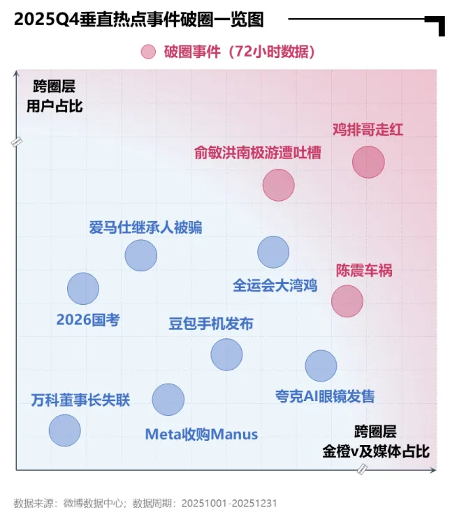 微博数据显示,2025年第四季度共产生热搜5.98万个,形成社会热点(29%)、文娱热点(34%)、垂直热点(37%)的分布。其中垂直热点表现较为突出,相比第三季度占比提升4个百分点。鸡排哥走红、俞敏洪南极游遭吐槽、陈震车祸等事件,展现出在社交媒体上由垂直热点引发到大众传播的典型破圈效应。