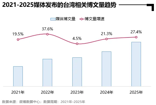 通过分析媒体发布的台湾相关博文量我们发现,围绕台湾相关议题的媒体报道力度显著增强,这反映了国家综合实力的提升和战略自信的深化。媒体通过系统性报道有效传递了维护核心利益的坚定立场。媒体声量的提高,不仅是信息传播能力的体现,更是国家软实力增长的重要标志,为塑造客观理性的舆论环境发挥了关键作用。