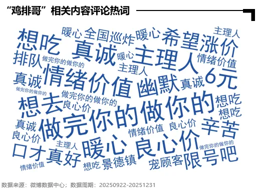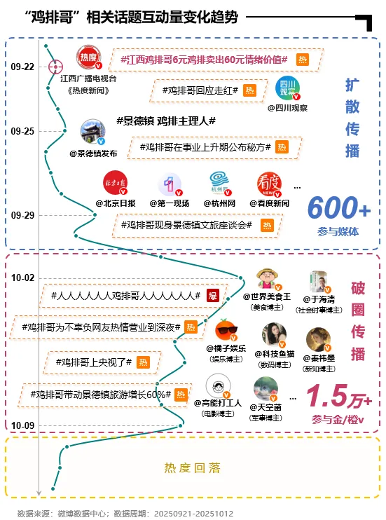 9月下旬,一位草根摊主“鸡排哥”凭借独特的经营风格与拉满的“情绪价值”迅速走红。其充满烟火气的现场画面、幽默直白的“金句”以及透明的操作过程,快速引发用户共鸣并刺激互动(点赞、评论、转发)。在公众自发传播的基础上,媒体和大v账号的介入,完成了事件从“趣闻”到“现象”的破圈传播。