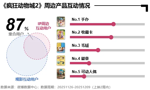与茶饮等品牌联名高频次、低单价的消费特点不同,周边则属于低频次、高单价的收藏性消费,更多是粉丝向的深度互动。微博数据显示,《疯狂动物城2》周边产品的互动人群和观影互动人群的重合率接近90%。周边实际扮演了“深度价值的沉淀”角色,它们为那些被IP故事和角色深深打动的核心粉丝提供了情感宣泄和身份认同的载体。通过购买精心设计的手办、收藏卡等,粉丝将对IP的爱转化为长期的、可触摸的拥有感。而IP则实现了长期价值沉淀和粉丝经济转化。