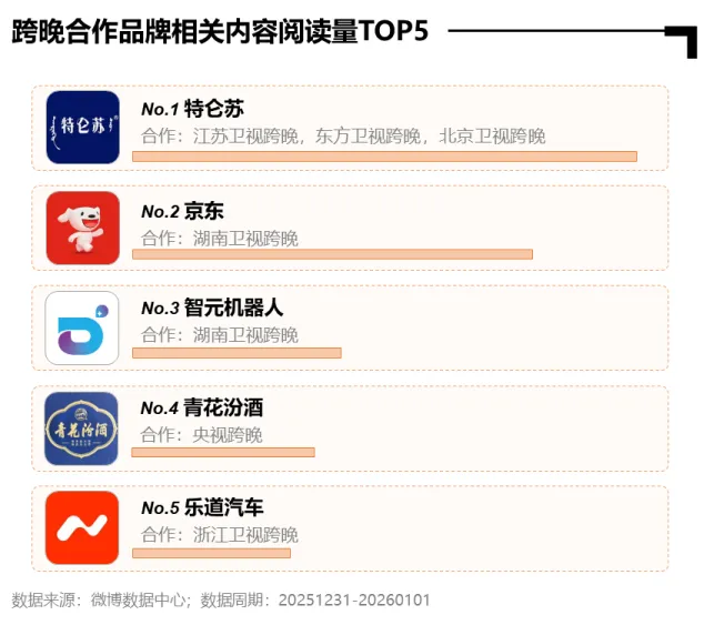 在今年的跨年晚会中,智元机器人、乐道汽车等科技品牌纷纷登场,表明科技企业已跻身晚会商业合作的核心阵营,其重要性不亚于传统的消费品牌与互联网大厂。合作模式也超越了简单的品牌曝光,转向 “技术展示+情感共鸣” 的深度绑定。科技品牌加码跨年晚会,核心诉求已从购买流量入口,升级为借助国民级IP的信任背书和情感场域,塑造有温度的科技品牌形象,并直观演示技术的应用价值。