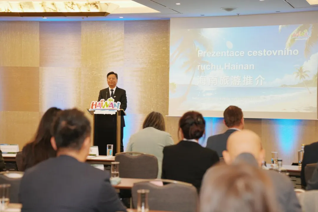 陈铁军在致辞中重点推介了海南丰富多样的旅游资源与核心优势,海南是全球公认的最安全的旅行目的地之一,拥有优良的环境、多元的文化与友善的社会氛围。海南拥有完善的旅游基础设施和高品质、高性价比的旅游产品。目前海南高端酒店均价相比欧洲主要旅游城市同类酒店更为实惠,游客可享受到物超所值的度假体验。同时,海南拥有众多风格多样的高尔夫球场,能够充分满足捷克游客对专业高尔夫运动的深度需求。海南将始终把游客的安全与体验置于首位,为欧洲游客打造一个安心、舒心、热情友好的度假环境。