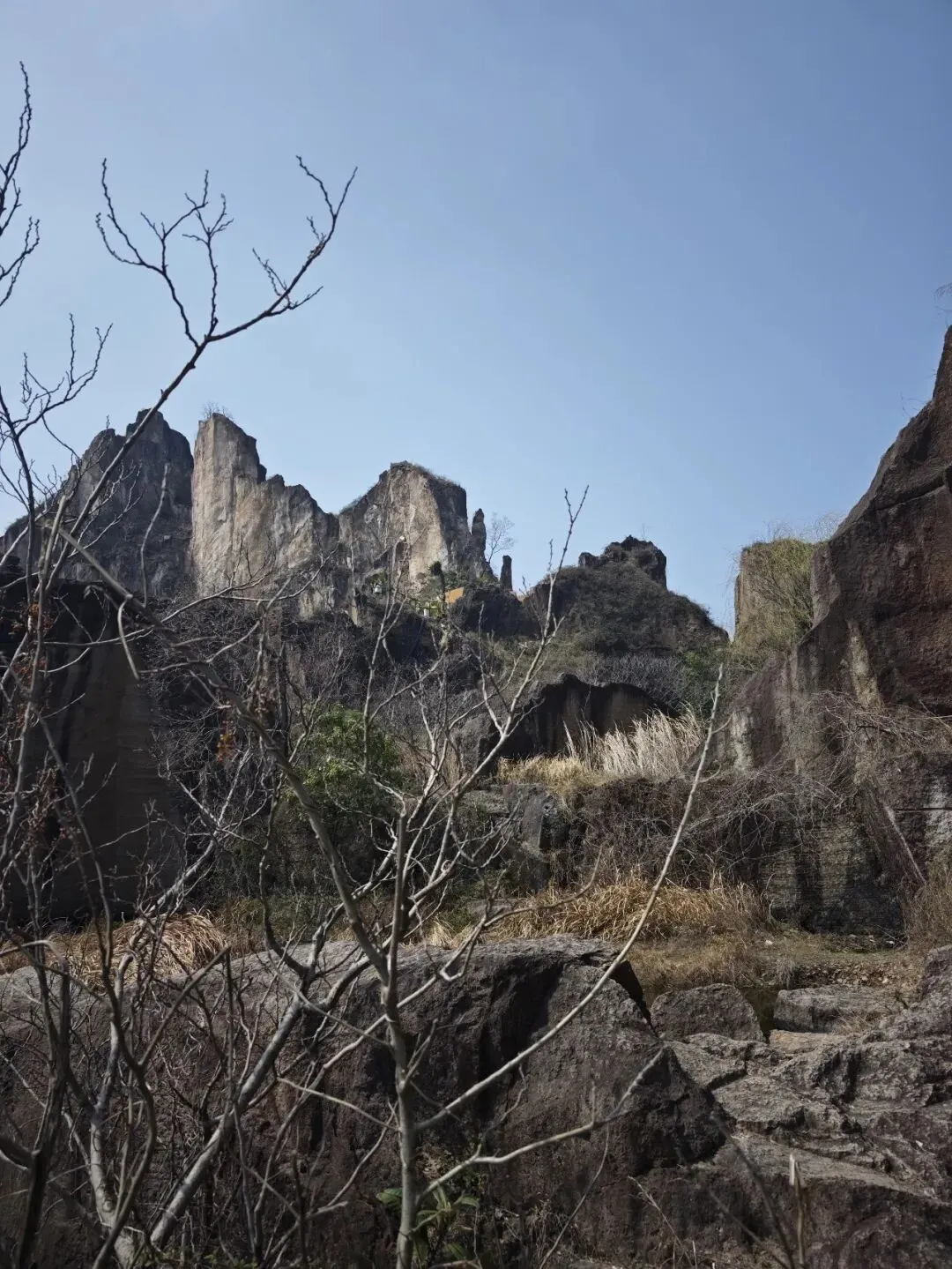 距绍兴中心城区16公里处有一小众探险类景点,羊山石城与石佛寺,网上褒贬不一,恰逢双休日,趁天清气朗,在女儿积极推荐下,驱车前往,导航羊山石城,入口处就有一停车场,不大,可停二三十车,每小时5元。事后发现在不远的攀岩馆旁导航EMO羊山秘镜,可以找到一个更大型的停车场费用更便宜每四小时5元,你也可发现不少车就停在路边,不过会不会被拍无法知晓。