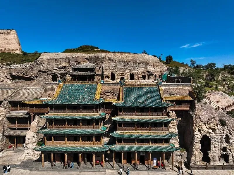 始凿于北魏,中国四大石窟之一;东西绵延约 1 公里,现存 45 个主洞窟、5 万余尊造像,第 20 窟露天大佛是标志性杰作,融合了中原与西域佛教艺术风格。