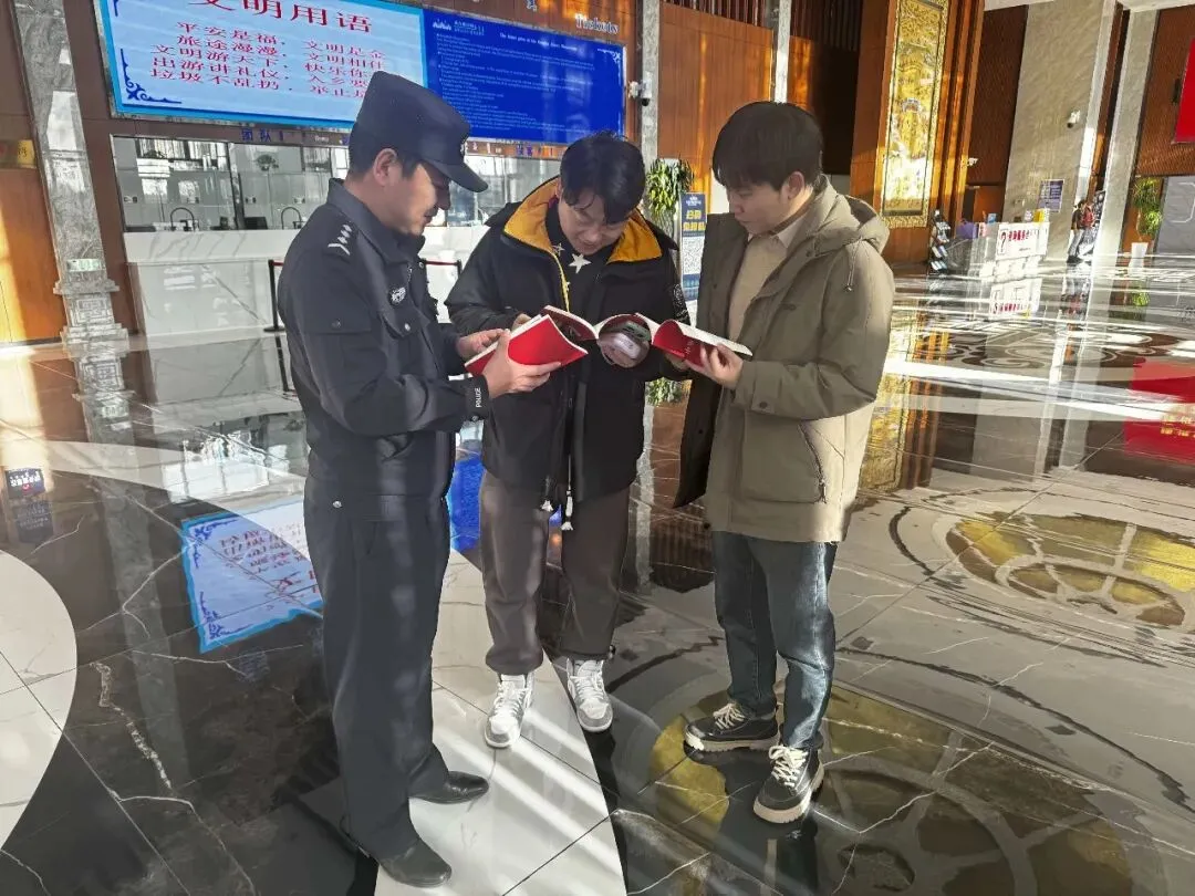 活动现场,民辅警通过多种形式开展立体化宣传:在旅游区大厅电子屏循环播放《中华人民共和国反恐怖主义法》宣传画面,让往来游客直观感受反恐法治氛围;在服务点位设置宣传资料架,摆放《反恐怖主义法》手册、反恐防范指南等资料,方便群众随时取阅学习;同时,民辅警主动走近游客,面对面讲解反恐法律法规、识别涉恐线索的方法及突发情况应对技巧,耐心解答群众疑问,切实将反恐知识传递到每一位群众身边。