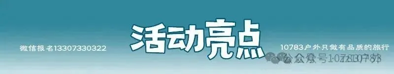 户外活动必须告知的各种潜在风险,如:扭伤、摔伤、骨折、疾病、坠崖、失温、砸伤、山体滑坡、交通事故、溺水事故、人为侵害、动植物伤害等以及其他未列入的一切风险,可能会导致身体瘫痪、甚至死亡,请根据自身的体能、经验、装备等情况参与合适自身的活动。