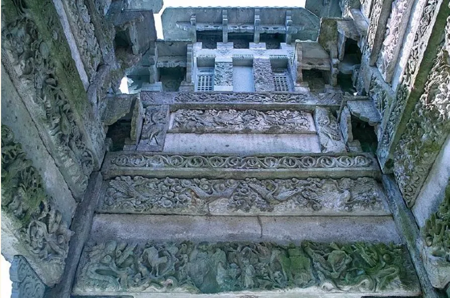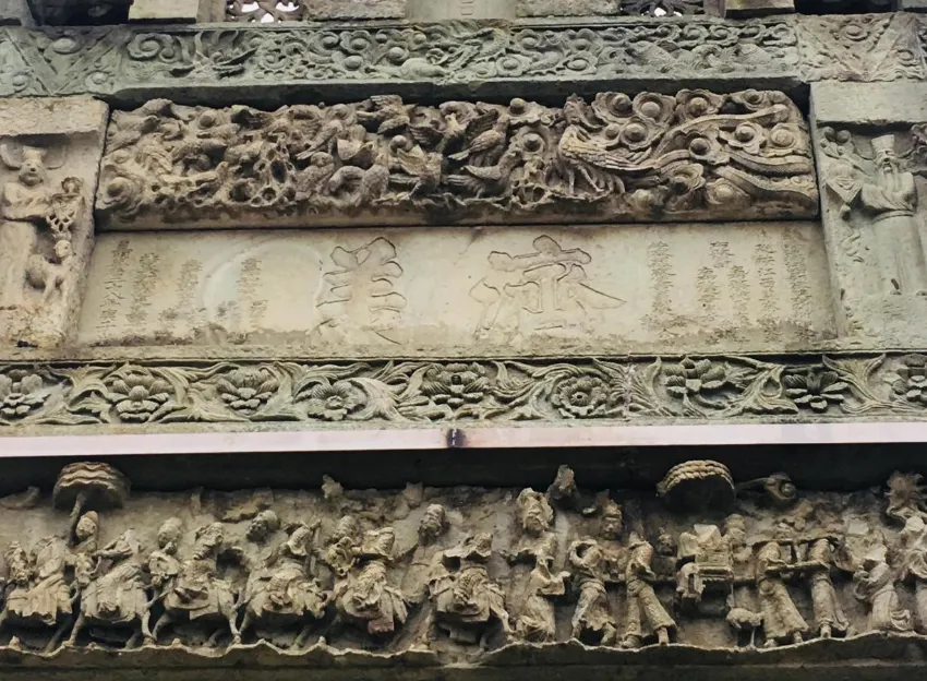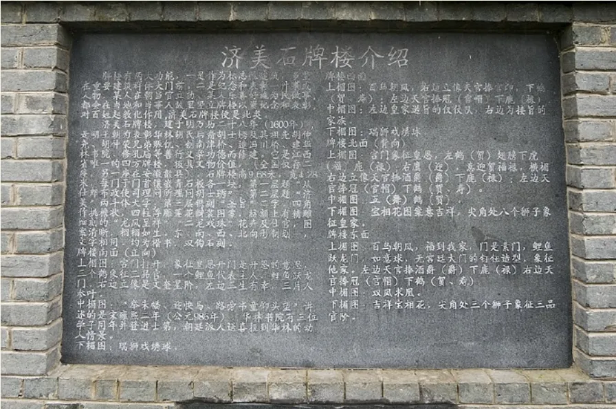 牌坊上石刻人物造形别致,栩栩如生,虽历经400多年的风雨,但流畅的线条,苍劲的笔力,依然清晰可辨。坊内四方各层青石板上均有题记,刻有一千多字的建坊始末,记录了华林胡氏捐廪赈饥民、架桥修路、创办华林书院、创建孔子庙等济美事实。牌坊上还记载着华林胡氏四段千古流传的佳话。尤其是南面第二层横梁上(图12),“举朱幡、迎快马、路旁书童仰头望”,六匹快马千里送喜报的石刻,讲述的是,宋雍熙二年(公元985年),奉新华林书院有三位学子,同年并登进士第,朝庭派人送喜报到华林的动人情景。宋太宗还写诗赞曰“黄河曾见几番清,罕见人间有此荣。千里朱幡迎五马,一门黄榜占三名……”