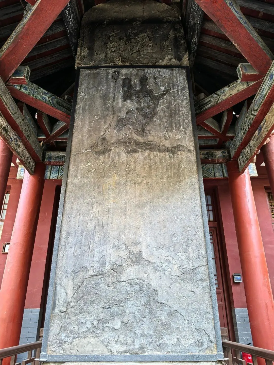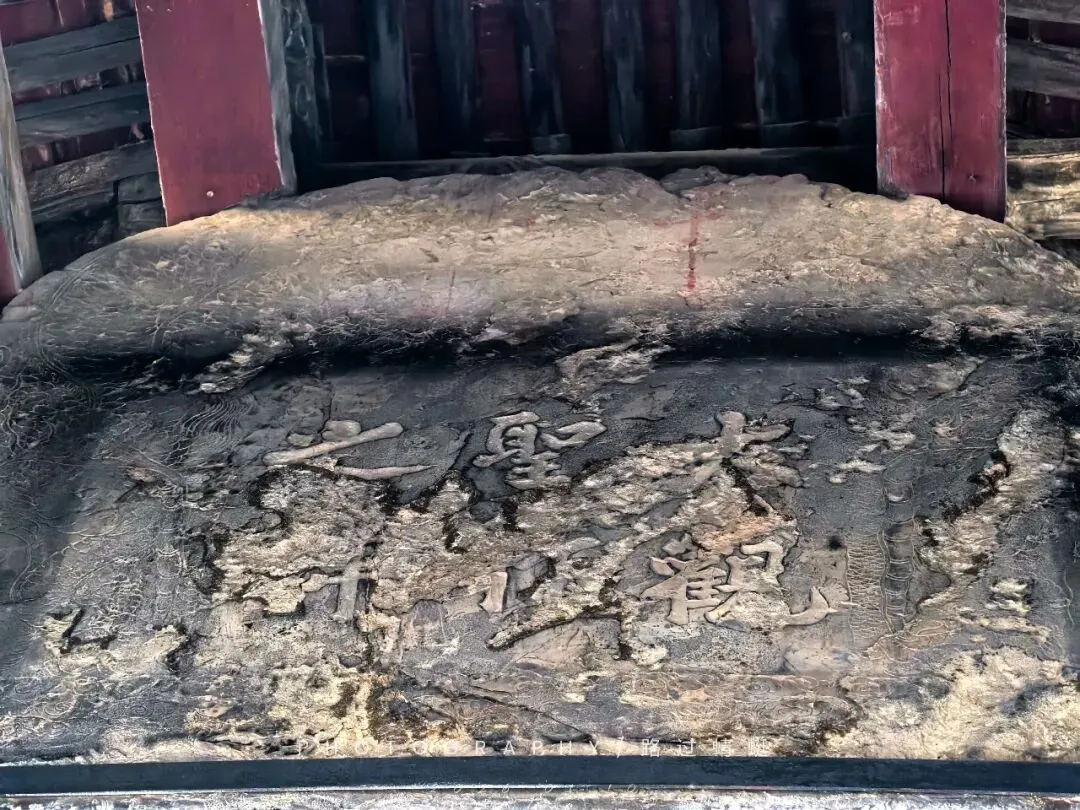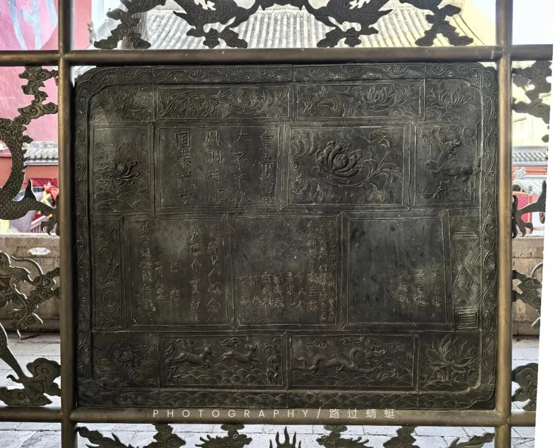 在献殿的正前方中央位置摆放了一个大铜镜,高1.1米,宽1.4米,重500斤,铸造于明代万历四十四年(1616年)。铜镜背后铸有各种吉祥图案,中间为楷书铭文,上方大字“皇帝万岁、太子千秋、风调雨顺、国泰民安。”下方为捐送人、铸造人姓名和万历四十四年七月吉日纪年铭文。在博物馆见过各种铜镜,但我第一次见到这么大的铜镜!