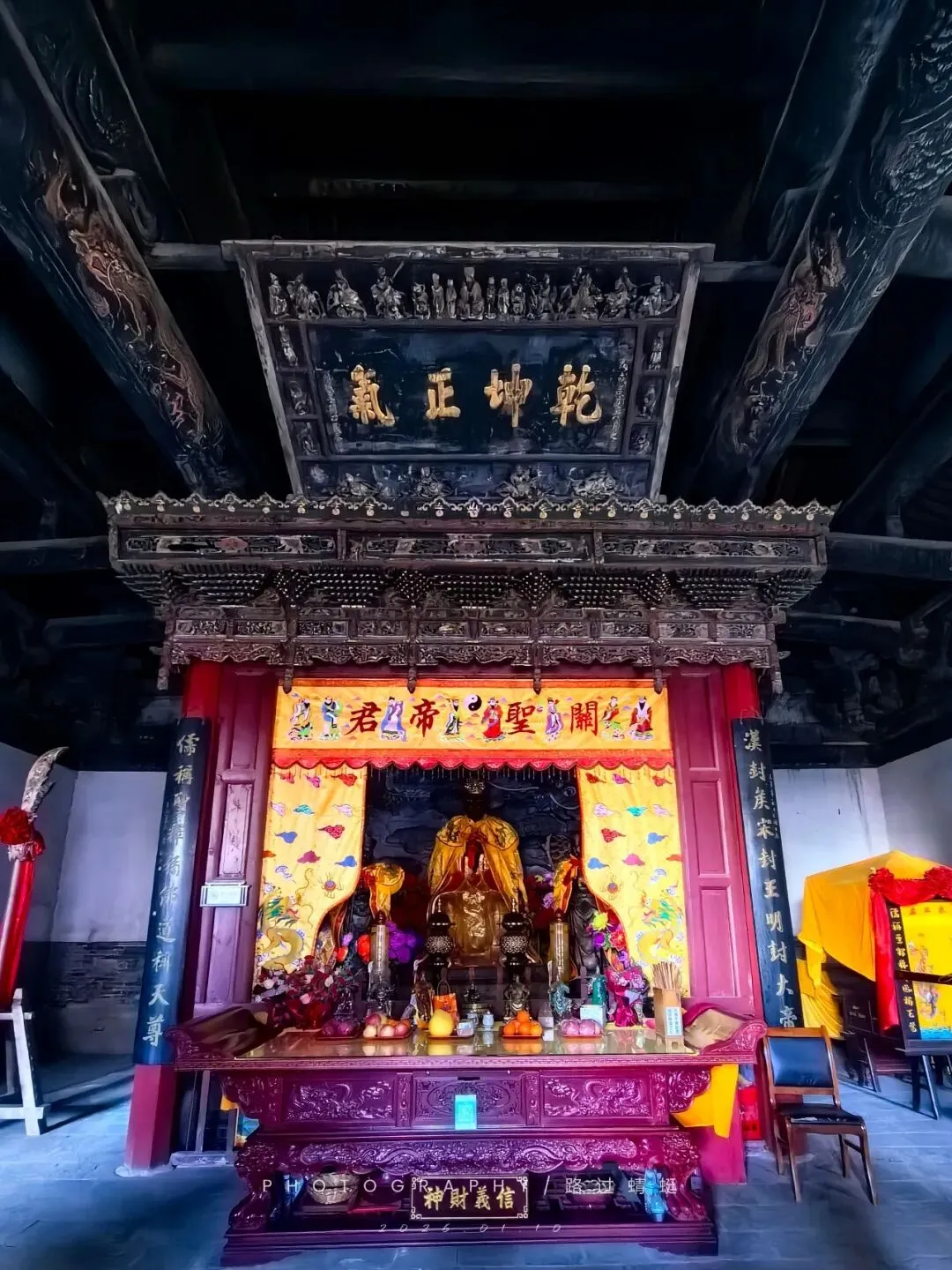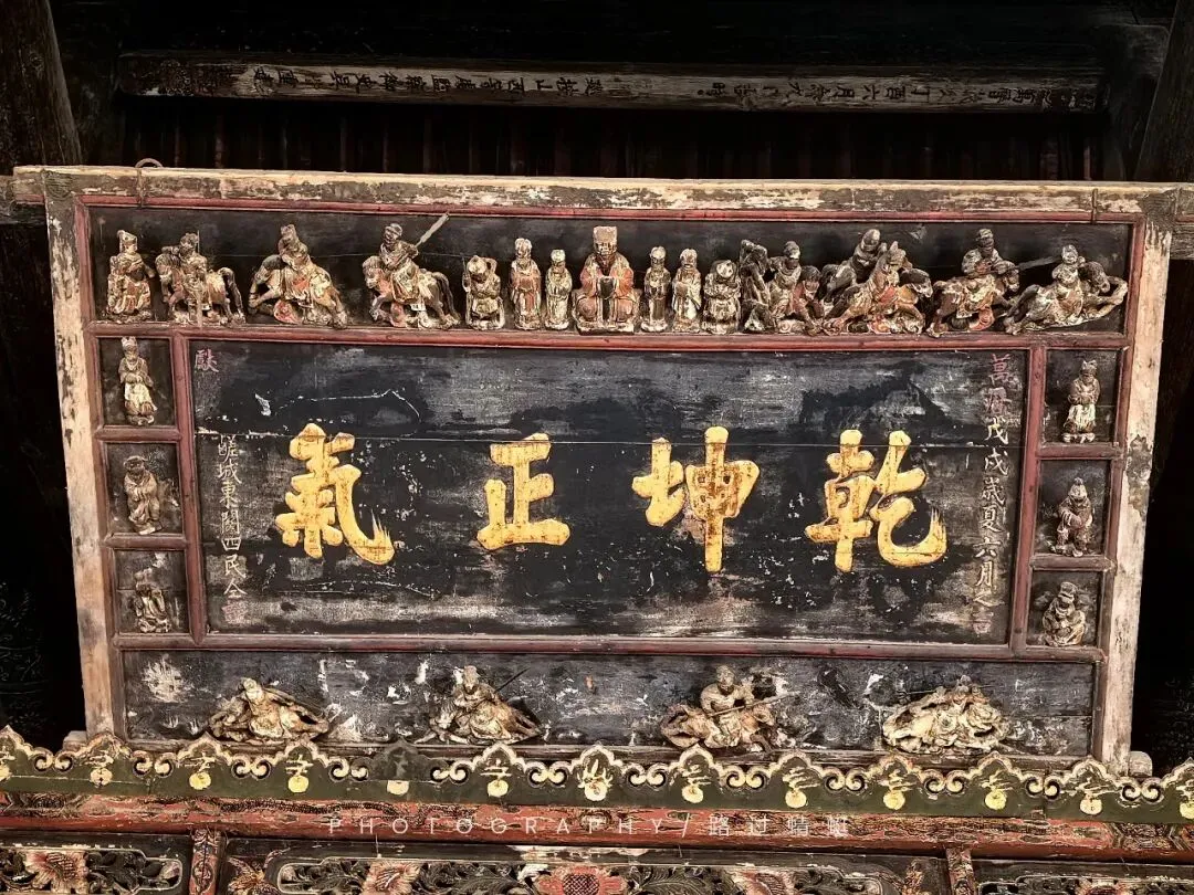 顶端悬挂“乾坤正气”横匾。此匾是明万历二十六年(1598年)运城百姓捐送的。这块匾远比一般的匾繁复,四周雕有26个形态各异的人物。其中有关公骑马征战图,雕刻精细,形象生动。(清晰度只能这样了。毕竟它只是部手机,我不能要求它更多,它已经尽力了。)