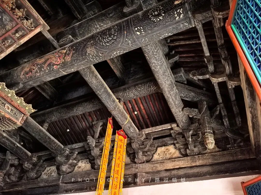 面阔三间、进深两间,单檐悬山顶。前后檐下施雕龙石柱八根(不过这个新刷的漆能闪瞎人眼