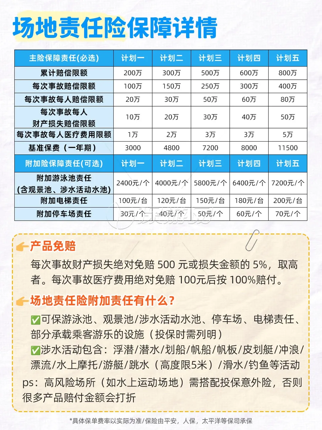 光有基础的人身和财产保障可能还不够,很多场地都有的特殊风险,需要靠附加险来覆盖。