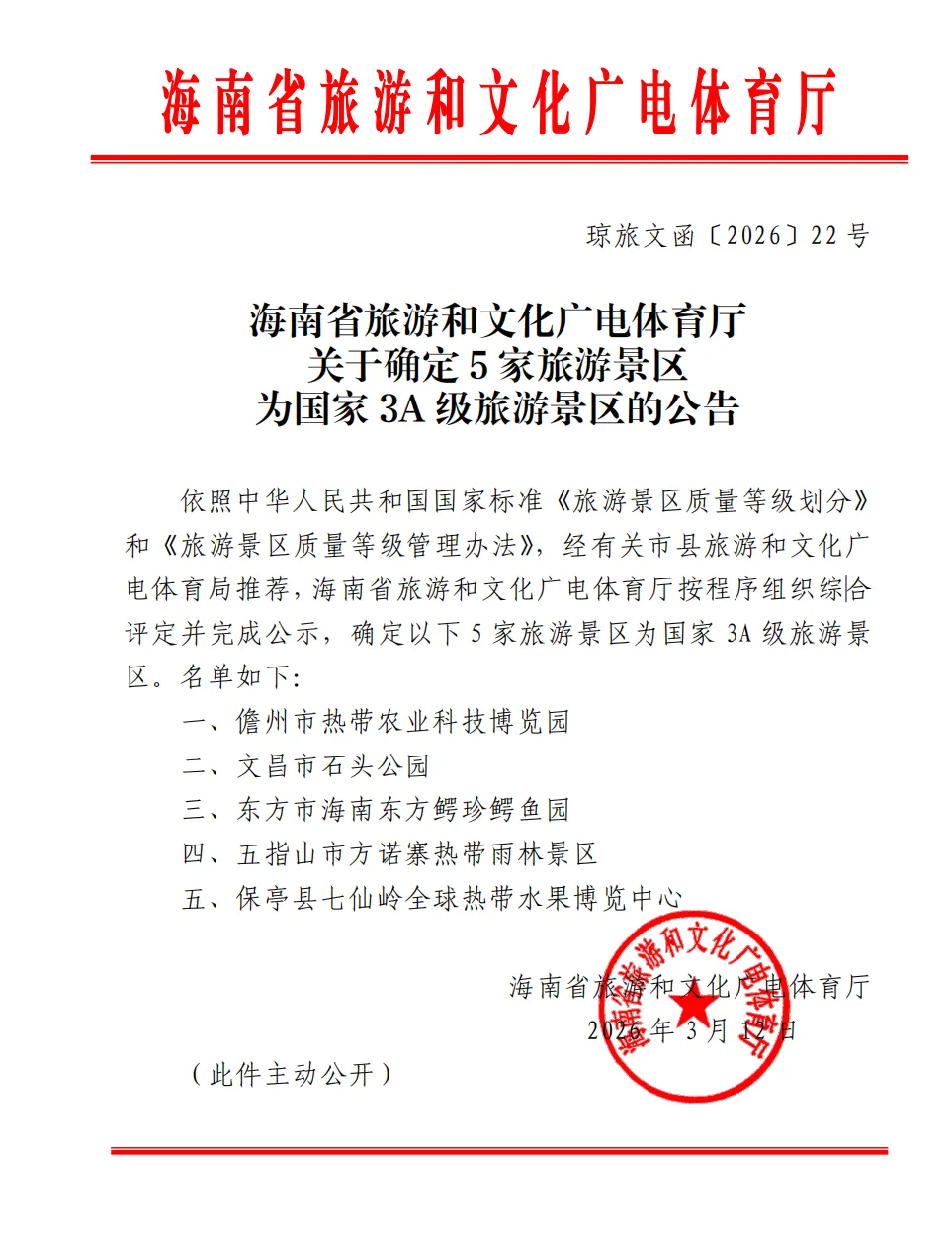 关于确定 5 家旅游景区为国家 3A 级旅游景区的公告