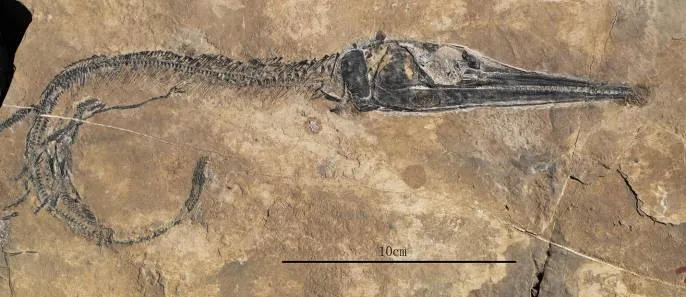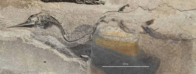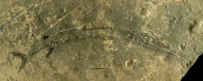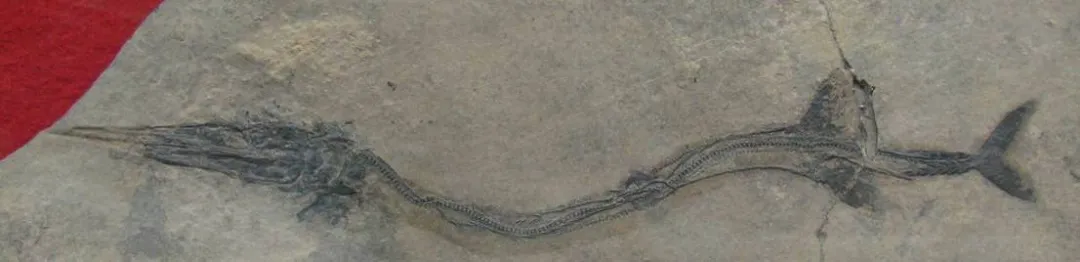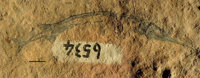 云南龙鱼,国家三级重点保护古生物化石, 中等体型,头部长度超过全长的1/3,鳃盖呈长椭圆形,上颌骨菜刀形,全身6列鳞,背侧鳞列与腹侧鳞列均呈肋骨状。