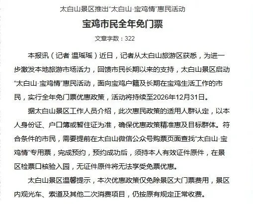 具体适用人群如何认定,《宝鸡日报》日前的报道给出了答案。据太白山景区工作人员介绍,此次惠民政策的适用人群认定,以本人身份证、户口簿或暂住证为准,确保优惠政策精准惠及目标群体。符合条件的市民,需要提前在太白山微信公众号购票页面查找"太白山·宝鸡情"专用票,完成预约,预约成功后,须持本人有效证件原件,在景区检票口核验入园,无证件原件将无法享受免票优惠。