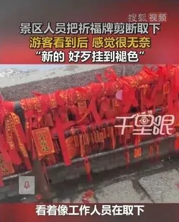 近日,山东泰安某景区内,一名工作人员剪断并取下游客悬挂的祈福牌的视频在网络引发热议。视频中,工作人员手持工具,将挂在栏杆上的祈福牌逐一剪断,不少看似刚悬挂不久、字迹清晰的新牌也被一并取下,游客目睹后满是无奈,直言“新的,好歹挂到褪色”。