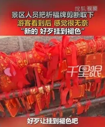 “特意花了钱买祈福牌,认真写下心愿挂上去,还没等风吹日晒褪色,就被剪掉了,心里特别不是滋味。”现场一名游客表示,祈福牌对游客而言,不仅是一件小物件,更是承载心愿的情感寄托,即便需要清理,也应优先清理旧牌、褪色牌,如此“一刀切”剪断新牌,实在难以接受。该游客的说法得到不少网友共鸣,有网友留言称,“祈福的意义就在于长久的寄托,刚挂的就被清走,太伤游客的心”。