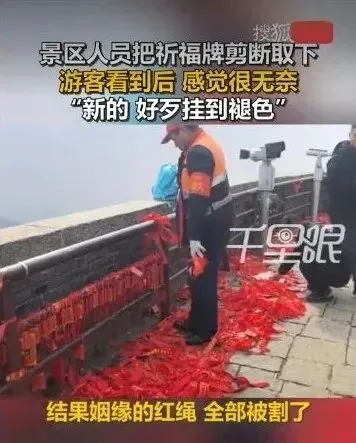山东泰安一景区 剪断新祈福牌引争议 游客:好歹挂到褪色