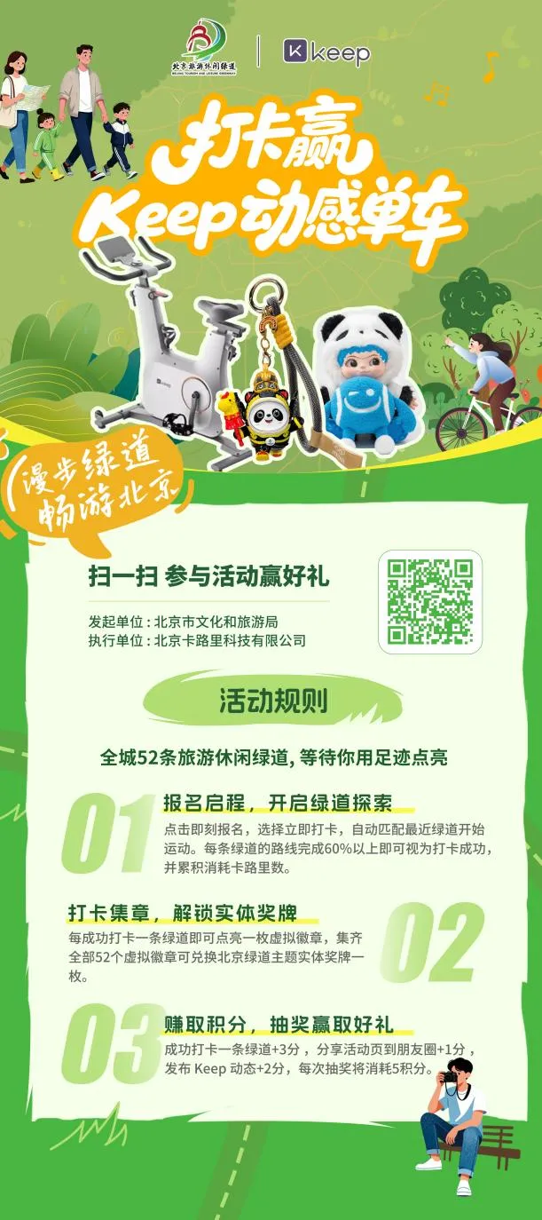 Keep打卡运动赏春:参与Keep绿道打卡活动,沿着赏花绿道慢跑、徒步、骑行,每打卡一条绿道即可点亮虚拟徽章,集齐徽章兑换绿道主题实体奖牌,赏花、运动两不误,解锁健康春日生活;