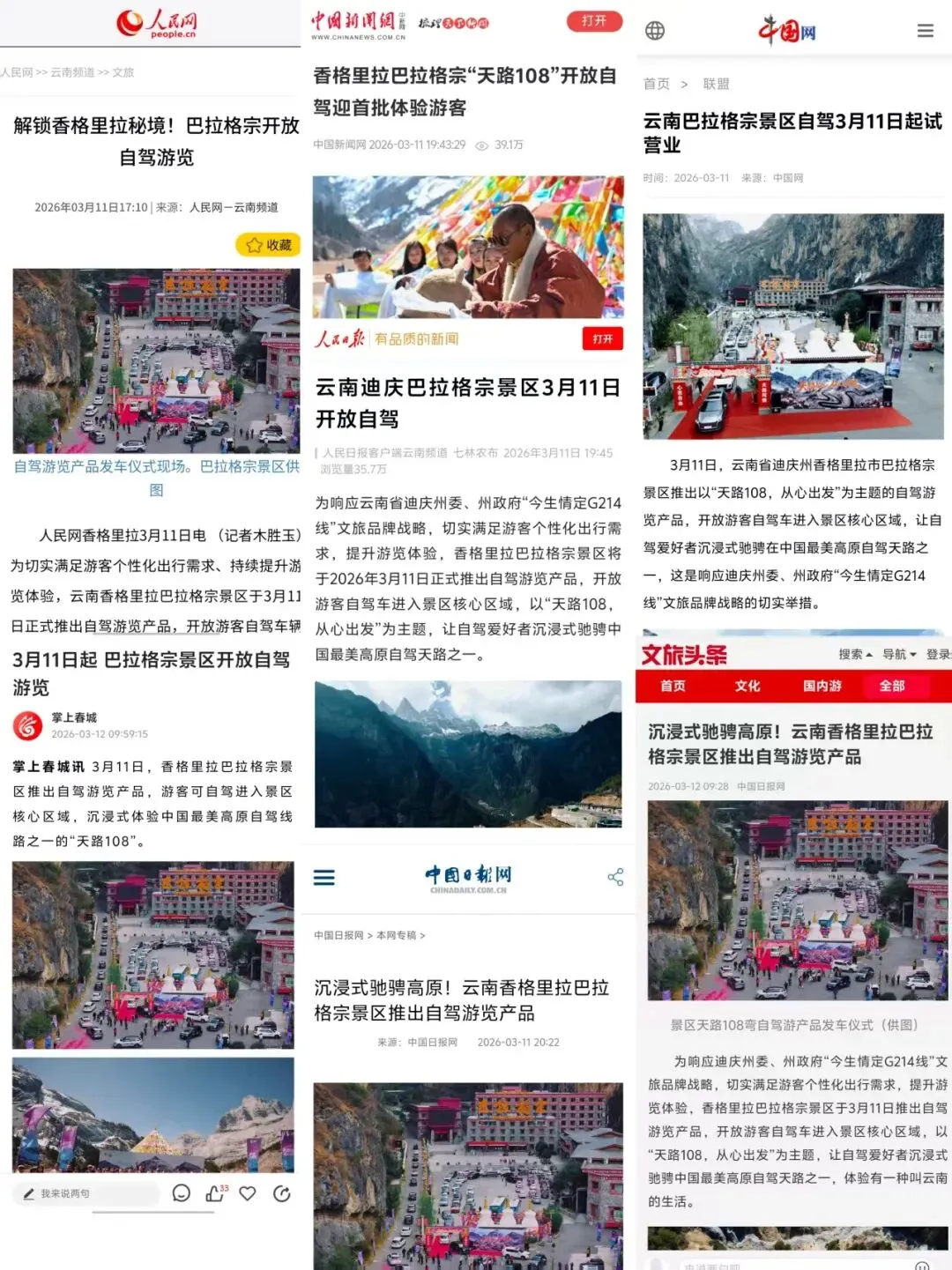 编者按:3月11日,香格里拉巴拉格宗景区推出“天路108,从心出发”自驾游览产品,让游客沉浸式体验香格里拉的壮美风光与人文魅力。人民日报、人民网、中国日报、中国新闻网等主流媒体关注报道,展现了景区在满足游客个性化出行需求、提升游览体验方面的积极探索。