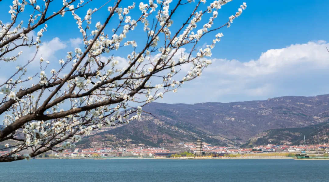 当樱花沿大圣湖畔绽放
