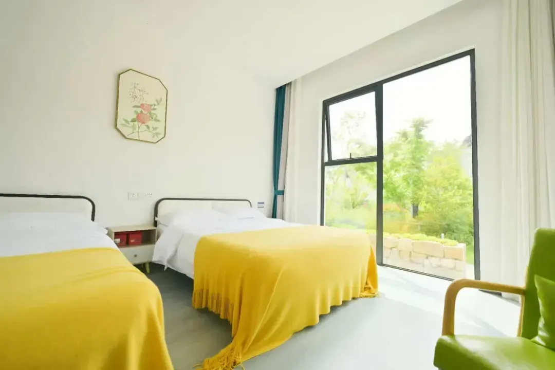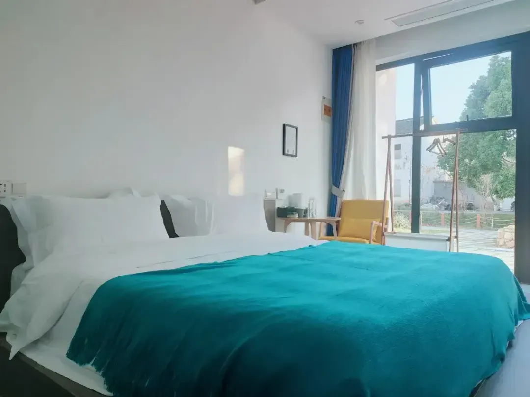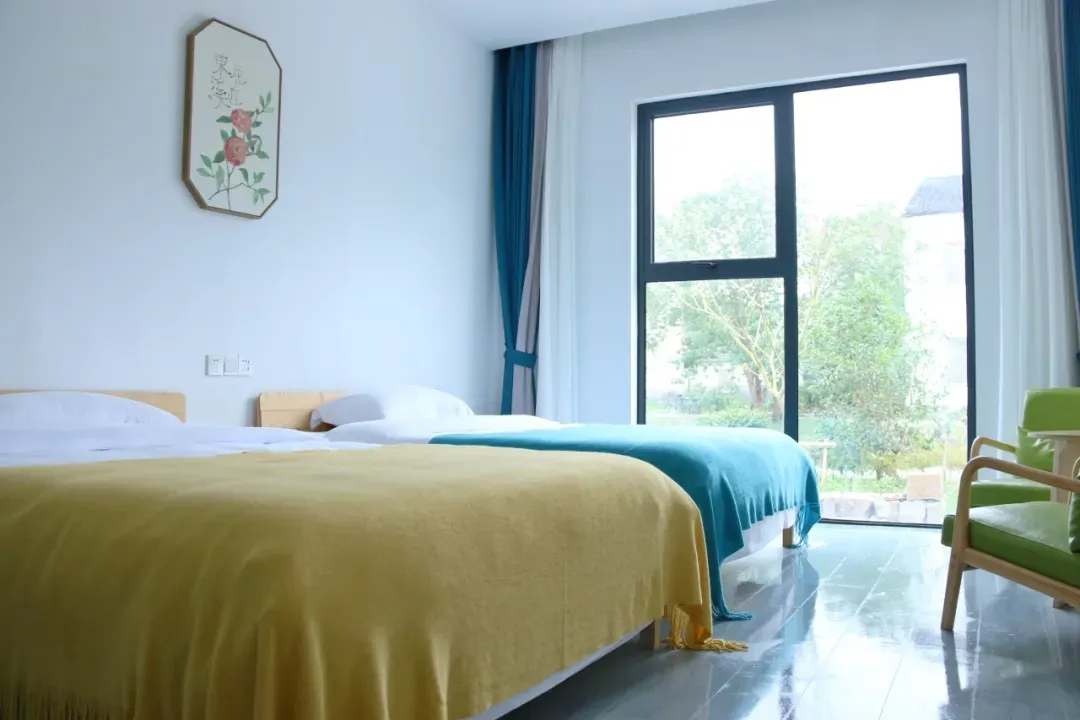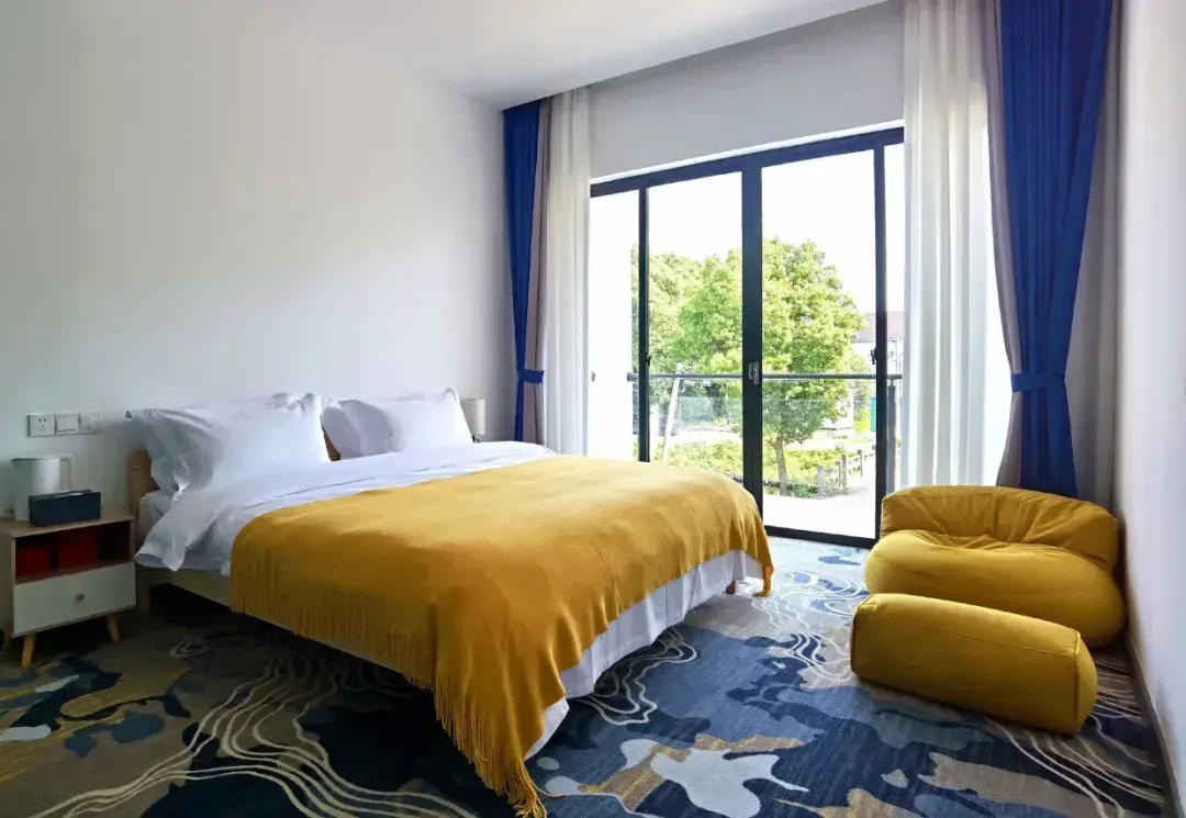 龙荡·花溪舍的房间设计以苏式雅韵为底色,通过原木、竹编等天然材质与青花瓷、苏绣等文化符号的融合,营造出宁静雅致的氛围;空间上采用落地飘窗引入田园景观,搭配榻榻米、茶台等功能区,兼顾实用性与文化体验;细节处提供智能卫浴、本地伴手礼等人性化服务,满足现代游客需求。