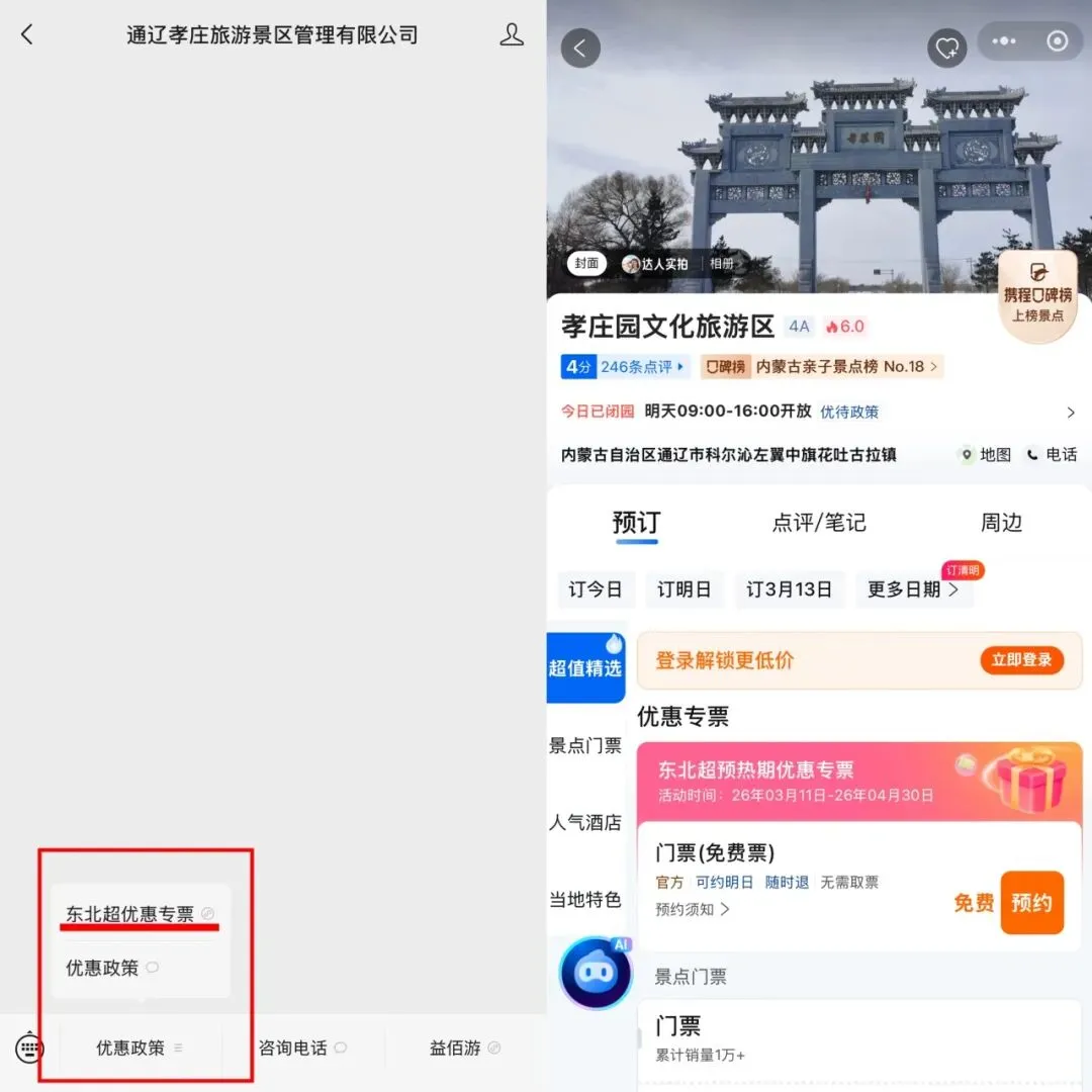2. 关注孝庄园文化旅游区官方微信公众号,在菜单栏找到优惠政策一栏通过“东北超优惠专票”通道完成预约。