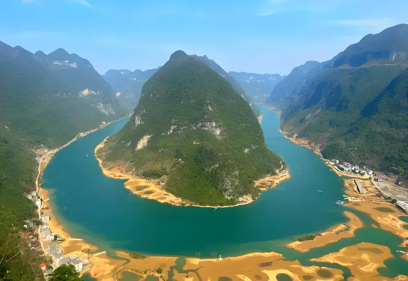 红水河在这里来了个180度大转弯,形成了一个“U”字形的大湾。河水碧绿如玉,两岸青山如黛。清晨或雨后,江面升起薄雾,渔船在雾中穿行,那画面美得像水墨画。这里是摄影发烧友的必打卡地,建议带上长焦镜头。