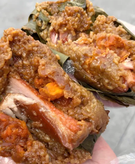 糯米的“豪华装甲车”!巴掌大的肉粽包着五花肉、板栗、绿豆,蒸到糯米油润透亮。一定要用忻城糯玉米,黏性堪比502胶水。最地道的吃法是切片煎炸,外脆里糯,蘸上白糖,咸甜交织,香到能当传家宝。