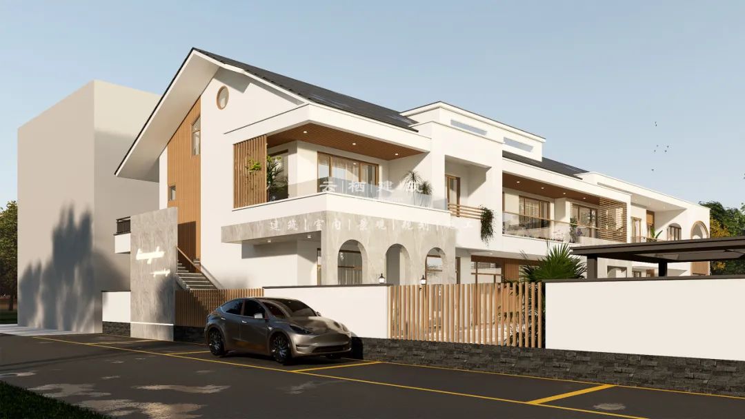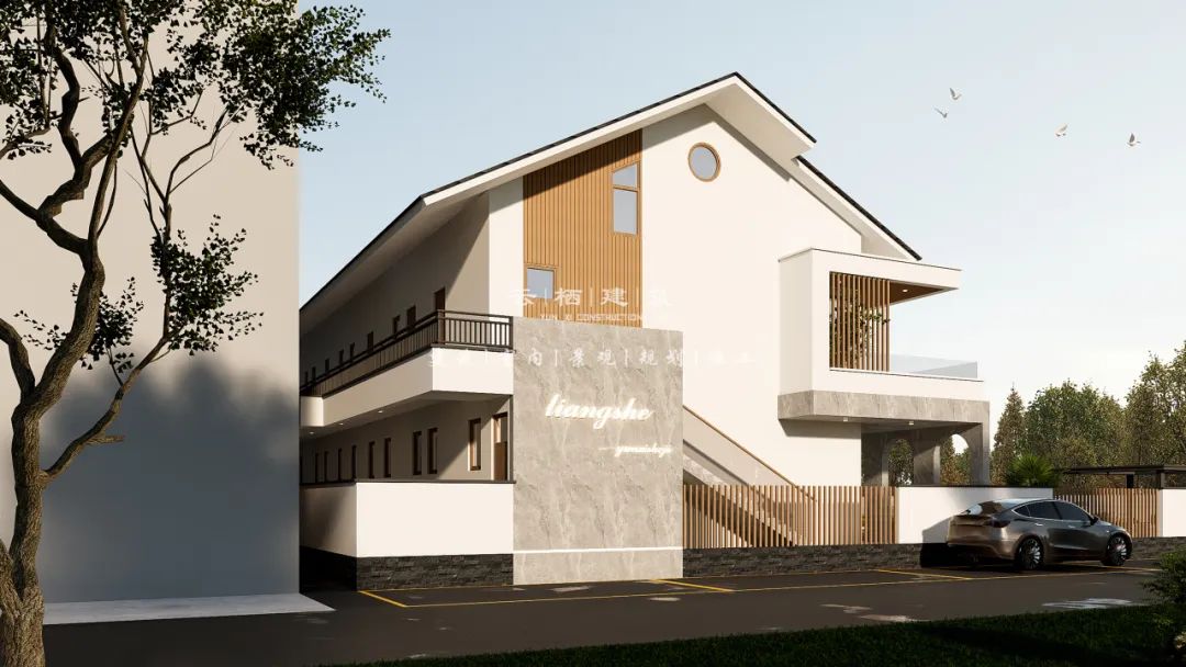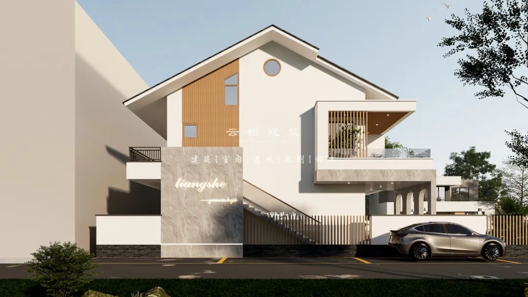 民宿的西侧外立面,也是设计的亮点之一。设计师打破传统,运用独特的线条和几何形状,打造出一个极具视觉冲击力的外观。