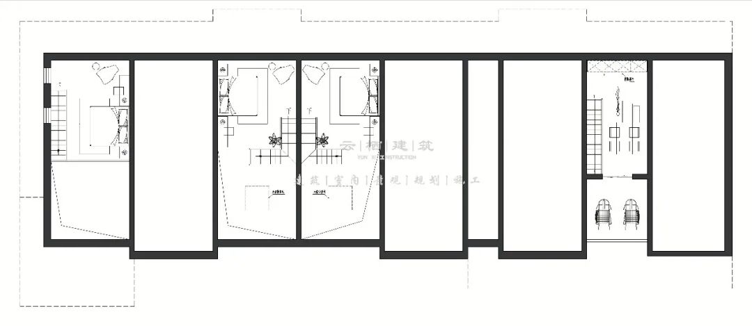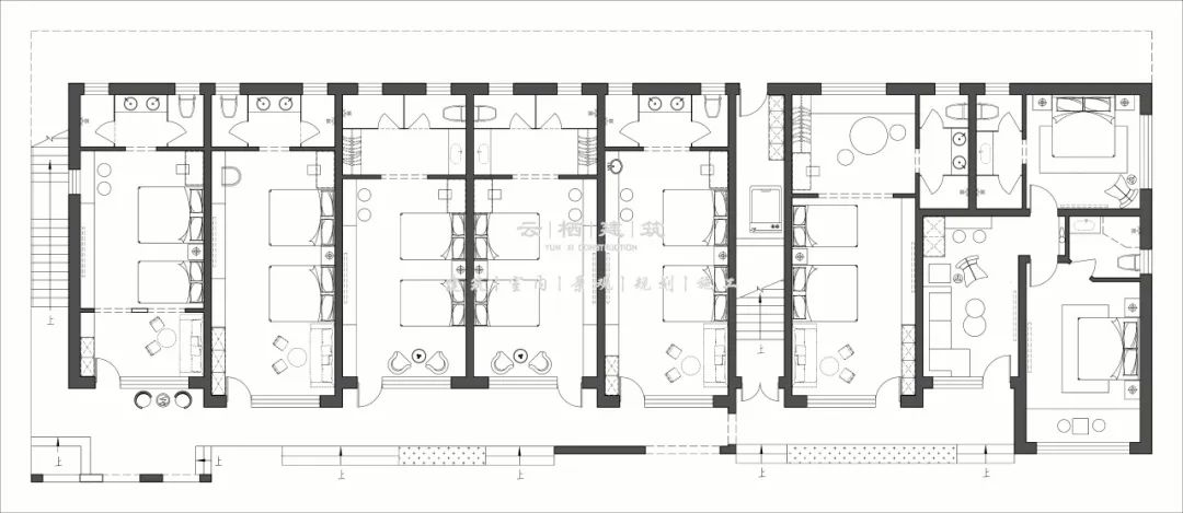 该民宿为一期,主要用作居住功能。为满足不同人群的需求,民宿共设计了16间客房,包括大床房、双床房和家庭亲子房等房型。