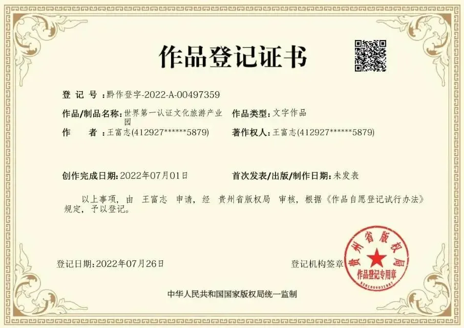 1. 世界第一认证文化旅游产业园:黔作登字-2022-A-00497359