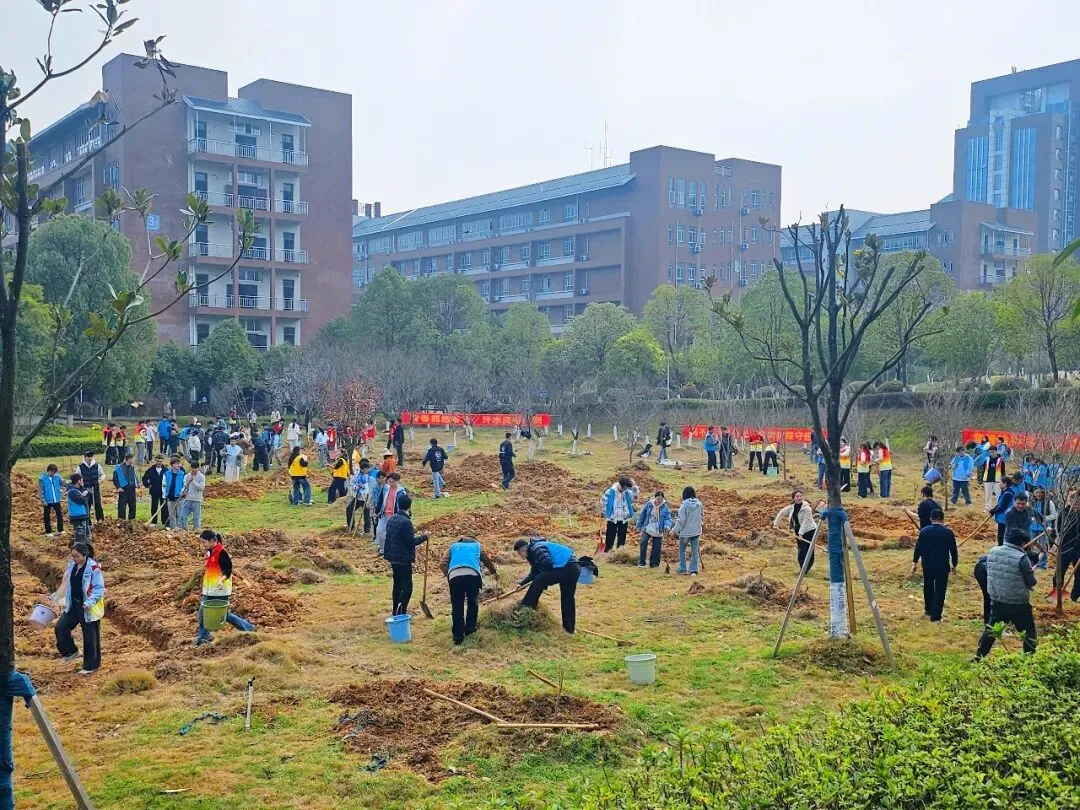 风拂过红砖教学楼,翻松的泥土混着草木清香漫开。师生们并肩忙碌,有人挥锹填土,有人提桶浇水,合力扶直树苗。铁锹碰土的闷响与欢声笑语交织,新栽的树苗在春风里轻轻摇晃,把生机扎进土里。
