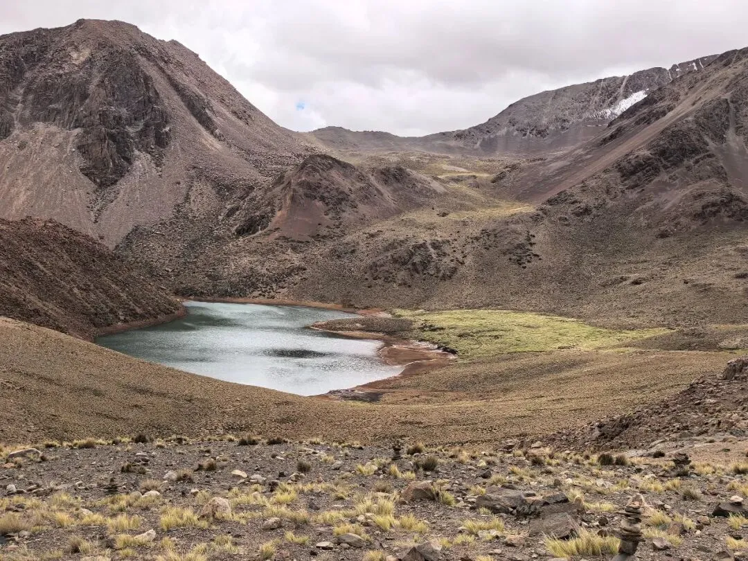 这湖是冰川退走后留下的冰蚀湖,被灰褐色火山岩环抱,山体碎石裸露,只覆着薄薄一层草甸。半月形湖面泛着浅蓝绿——那是高海拔冰川融水的专属色调。据说其色随光影流转,如高原的眼,总在变着法子看世界。岸边红褐砾石滩与黄绿草甸交错,为荒芜山体添了半分活气。海拔太高,无树,只有低矮草簇在风里静默,像大地未说出口的叹息。