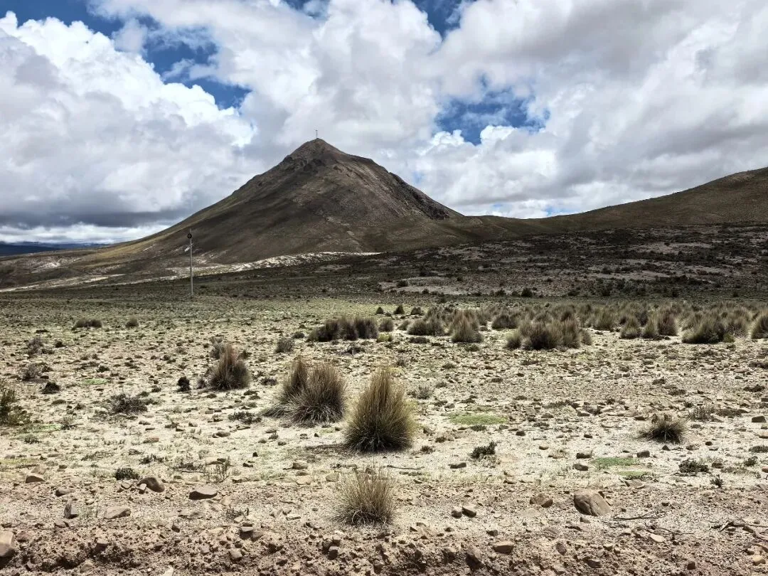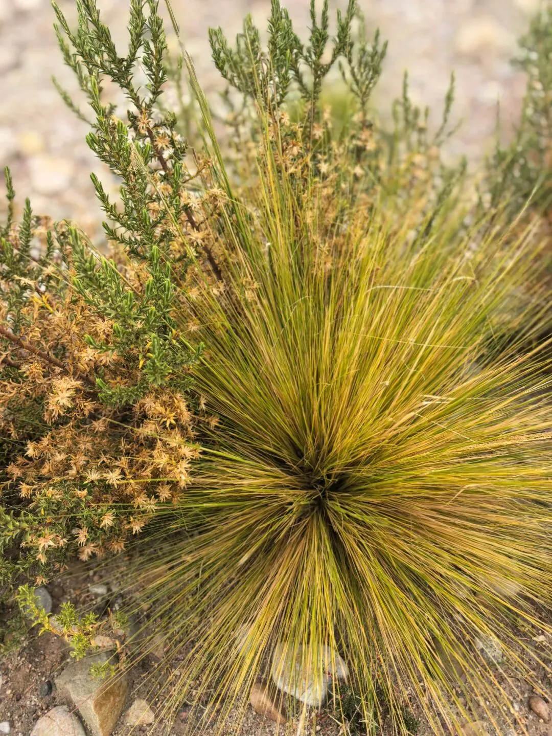 路旁植被稀疏,最扎眼的是金色伊丘草。细密草茎从砾石地里钻出,在干燥阳光下泛着暖黄光晕,给灰褐色大地铺上柔软绒毯。一丛丛密集生长,却又各自守着团簇的形态,风过时轻摇,像无数微小的金色喷泉。原以为是寻常针茅,查后方知是安第斯特有物种。