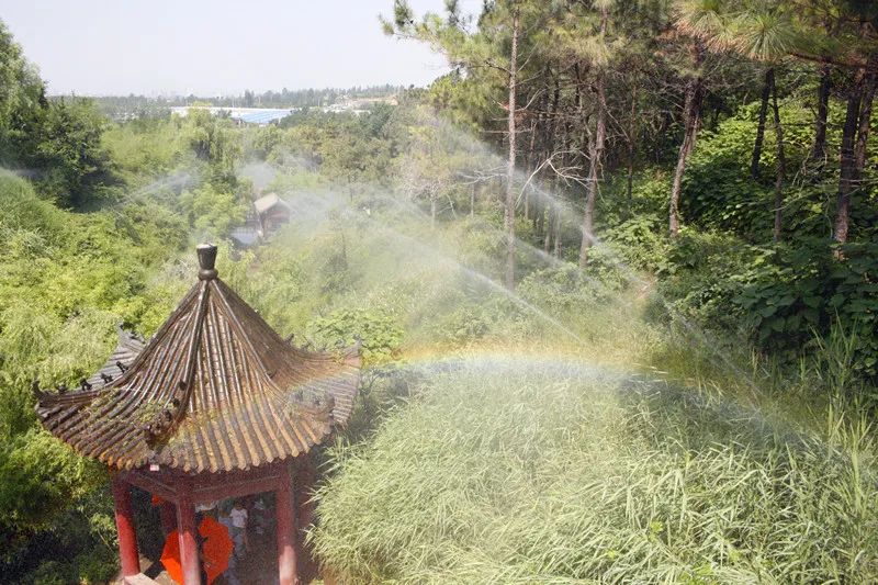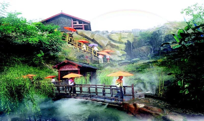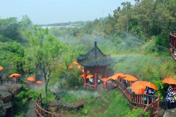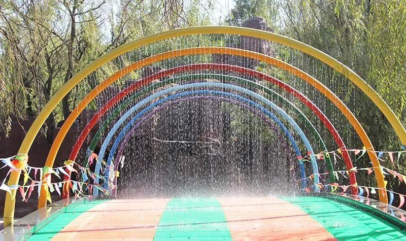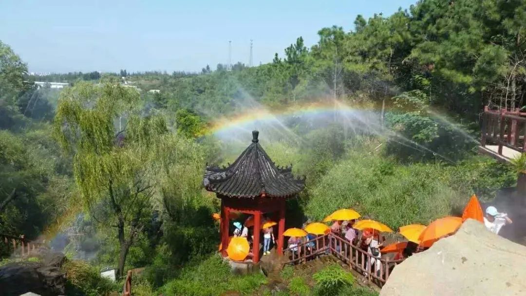 人工降雨利用阳光折射,创造晴天观彩虹的美景。浓浓的雨中风情,走过彩虹门,头上彩虹环绕,脚下溪流淙淙,游道旁缀以亭、台、楼、榭,会有天天见彩虹,日日沐祥雨。