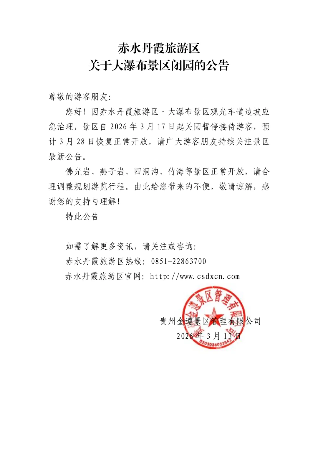 您现在的位置是:首页 > 国内旅游目的推荐 > 正文 国内旅游目的推荐 关于大瀑布景区闭园的公告 admin2026年03月13日 09:53:47国内旅游目的推荐1 关于大瀑布景区闭园的公告 转载请说明来源于"旅荐网",部分内容转载自网络,如有侵权请联系qlwl@foxmail.com删除 本文地址:https://www.15386.cn/post/141960.html 上一篇 859处-河南省A级旅游景区名录名单2026版 下一篇 清镇市十大必去旅游景点,来贵阳市一日游首选这里! 相关文章 清镇市十大必去旅游景点,来贵阳市一日游首选这里! 859处-河南省A级旅游景区名录名单2026版 来南京总统府景区的很多人没到过这里 旅行者周刊#26:广东16个5A景区,你去了几个? 鼓山是福州著名风景区,国家 4A 级景区,位 湖北省咸宁市有什么特色美食?有什么景点?这里有世界茶业第一古镇,华中最美溶洞隐水洞... 运城盐湖景区“一字长舟”仿古游船全新起航 安徽省“整治旅游行业导游乱象、强制消费等问题”维权指南 2026年度首次旅游行业协会秘书长联席会议 传承弘扬红色文化 推动红色旅游提质升级 发表评论 取消回复 评论列表 这篇文章还没有收到评论,赶紧来抢沙发吧~