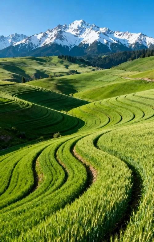新疆不是只有沙漠和戈壁,天山北麓这一带从古至今就是农耕区,江布拉克的麦田不是为了景观种的,是真正在生产的旱田,春小麦从四月播种到七月收割,整个周期你都能看到不同的景象,最好看的是六月下旬,麦子还没完全成熟,绿色和金黄色交织在一起,那种颜色的层次感是调不出来的。关键是这些麦田都在山坡上,坡度大的地方能到二十度,拖拉机上去都费劲,但就是这种地形反而种出了最好的景观效果,因为起伏够大,光影变化够丰富。