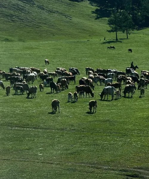 江布拉克的草原和内蒙古的草原不太一样,内蒙古的草原是平的,一眼看到天边,江布拉克的草原是立体的,长在山上的,你得往上走才能到真正的草甸区域,海拔一千八到两千一这个区间,草长得最好,这种高山草甸有个特点,草短但密,踩上去软但不陷,不是那种需要跋涉的深草,是那种让人想躺下的草。