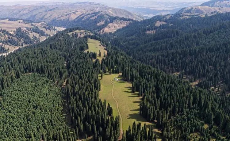 云杉林里的温度比外面低五六度,夏天进去特别凉快,但更重要的是它对水的调节作用,这些树能把天山的雪水留住,慢慢渗透到地下,最后形成山下的泉水和河流,江布拉克这个名字在哈萨克语里就是"圣水之源"的意思,指的就是这片森林涵养出来的水源,你在草原上看到的那些小溪,源头都在云杉林里。