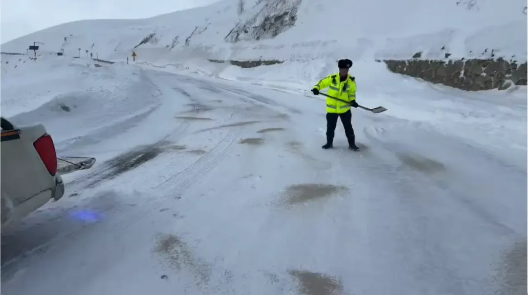 与此同时,阿勒泰地区公安喀纳斯景区分局交通管理大队全员出勤,前往辖区重点路段开展道路隐患排查与路面除险工作,在急弯、陡坡、结冰等路段铺撒防滑砂,确保道路可安全通行后,组织警车带道有序引导游客安全离园。