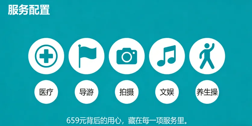 659元,包含高铁票、吃饭住宿、景点门票、接送大巴,沿途还配备医疗、导游、拍摄、文娱、养生操等服务。这个价格贵不贵?从用户反馈看,相当实惠。