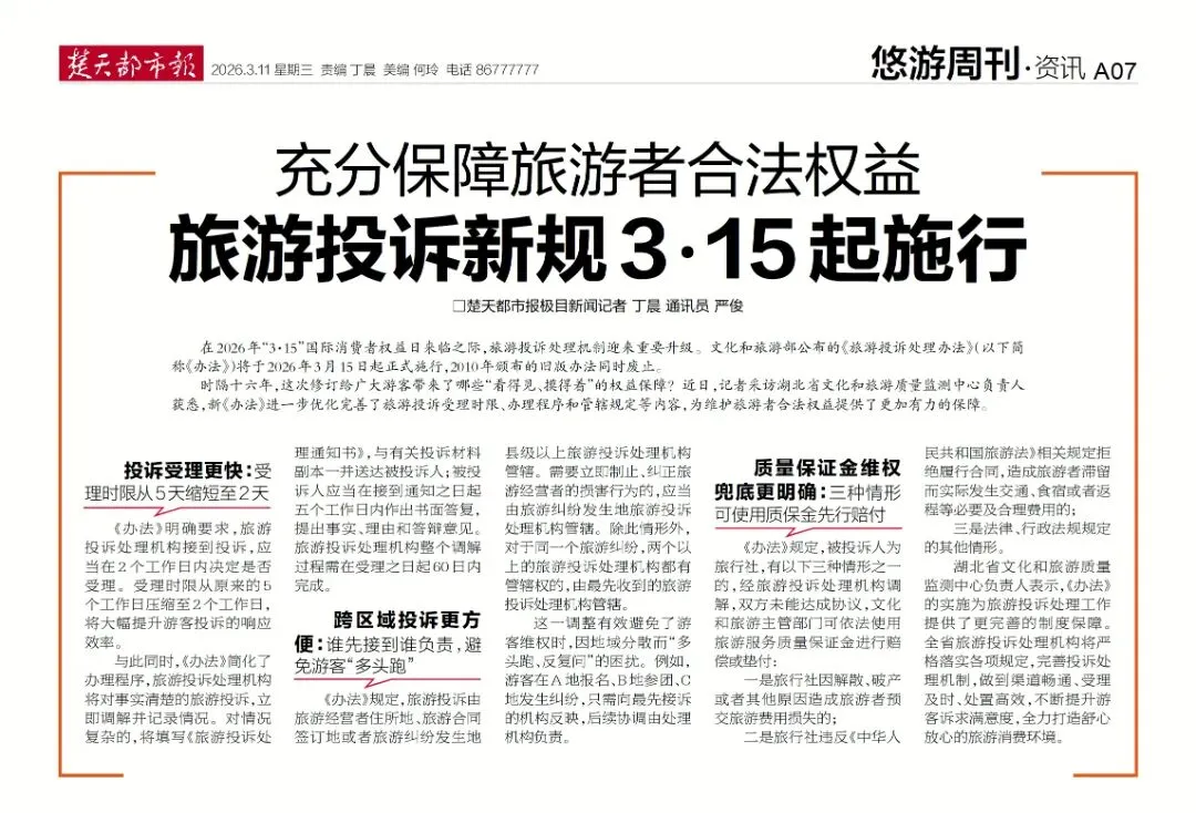 湖北省文化和旅游质量监测中心负责人表示,《办法》的实施为旅游投诉处理工作提供了更完善的制度保障。全省旅游投诉处理机构将严格落实各项规定,完善投诉处理机制,做到渠道畅通、受理及时、处置高效,不断提升游客诉求满意度,全力打造舒心放心的旅游消费环境。