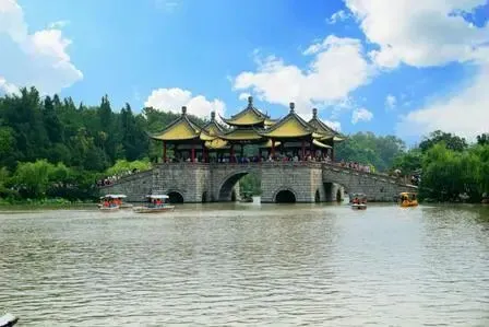 扬州:烟花三月,瘦西湖桃红柳绿,古典园林。